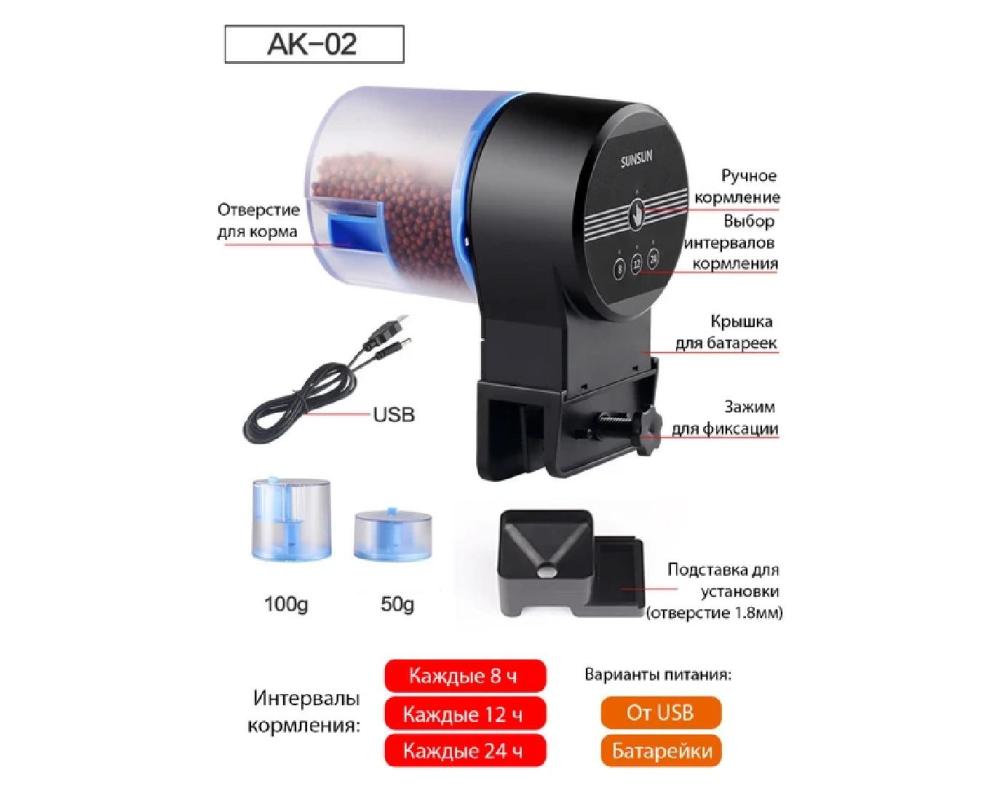Автоматическая кормушка SUNSUN AK-02 — надёжное решение для кормления рыб! Три режима подачи корма, работает от USB или батареек. Закажите прямо сейчас на нашем сайте или посетите магазин!