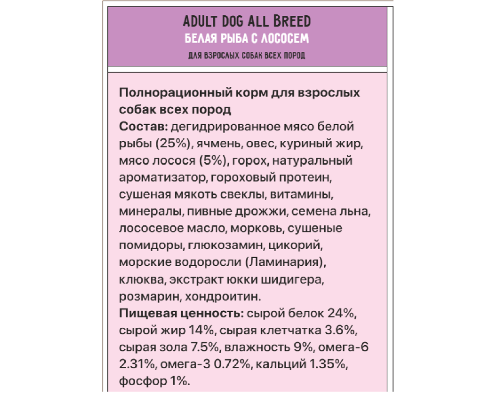 Полнорационный корм супер-премиум класса для взрослых собак всех пород. Основу рациона составляет гипоаллергенная белая рыба в сочетании со свежим лососем, что делает его идеальным выбором для животных с чувствительным пищеварением.