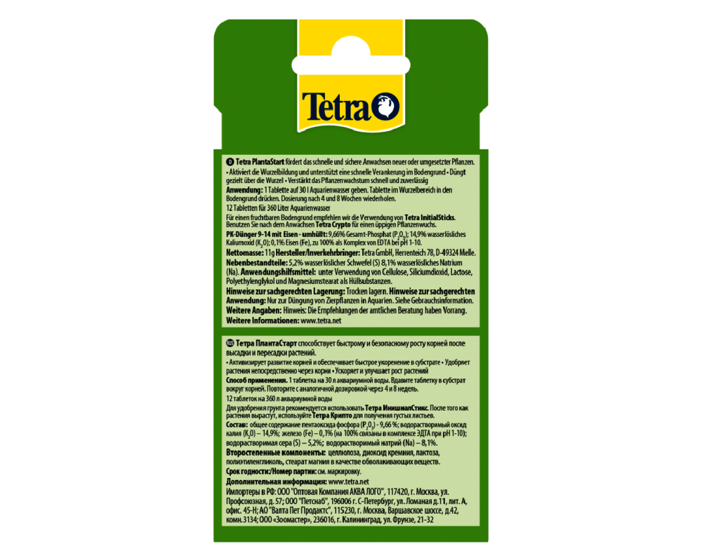 Tetra PlantaStart — это высокоэффективное стартоворе удобрение для аквариумных растений, обеспечивающее их необходимыми питательными веществами в первые дни после посадки. Этот продукт помогает растениям адаптироваться к новому окружению и способствует их здоровому росту.