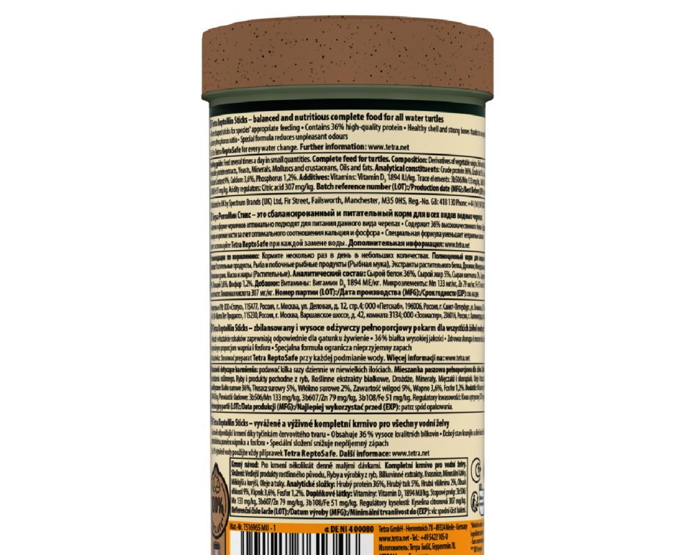 Tetra ReptoMin Sticks — это сбалансированный и питательный полноценный корм для всех видов водных черепах. Корм содержит 36% высококачественного белка, который способствует здоровому росту. Он дополнен кальцием и фосфором в оптимальной пропорции для поддержания здоровья панциря и крепости костей. Специально разработанная формула корма также уменьшает неприятные запахи в акватеррариуме и состоит из натуральных ингредиентов. Палочки специально адаптированы к требованиям и пищевым привычкам взрослых черепах, что облегчает их кормление. Уникальный рецепт, состоящий из высококачественных натуральных ингредиентов, без красителей и добавленных консервантов, способствует здоровому росту и крепкой иммунной системе.