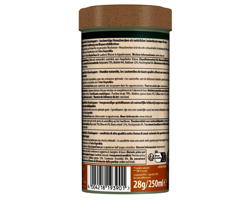 Tetra ReptoDelica Grasshoppers — идеальное натуральное лакомство для водных черепах. Оно не только вкусное, но и богатое белками, которые так необходимы для оптимального роста рептилий. Это прекрасное дополнение корма Tetra ReptoMin Sticks для обеспечения черепах сбалансированным и питательным рационом. Порадуйте свою черепашку вкусным и здоровым лакомством — кузнечиками Tetra ReptoDelica Grasshoppers.