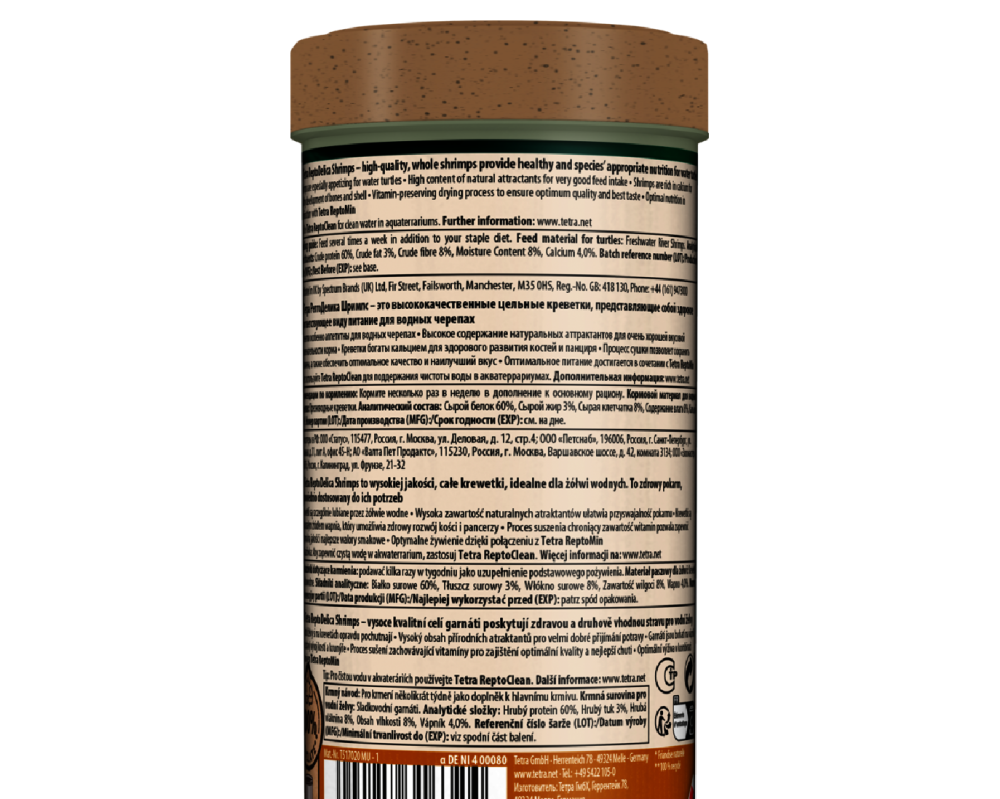 Tetra ReptoDelica Shrimps — идеальный натуральный корм для водных черепах. Целые креветки обеспечивают вкусную диету, полезную для здоровья и и подходящую данному виду. Содержащийся в креветках кальций поддерживает здоровое развитие панциря и костей. Кроме того, высокое содержание натуральных аттрактантов обеспечивает отличную вкусовую привлекательность и очень хорошее усвоение корма. Процесс высушивания сохраняет витамины, обеспечивает оптимальное качество и лучший вкус. Мы рекомендуем креветки Tetra ReptoDelica Shrimps в сочетании с Tetra ReptoMin Sticks для достижения наилучшего результата.
