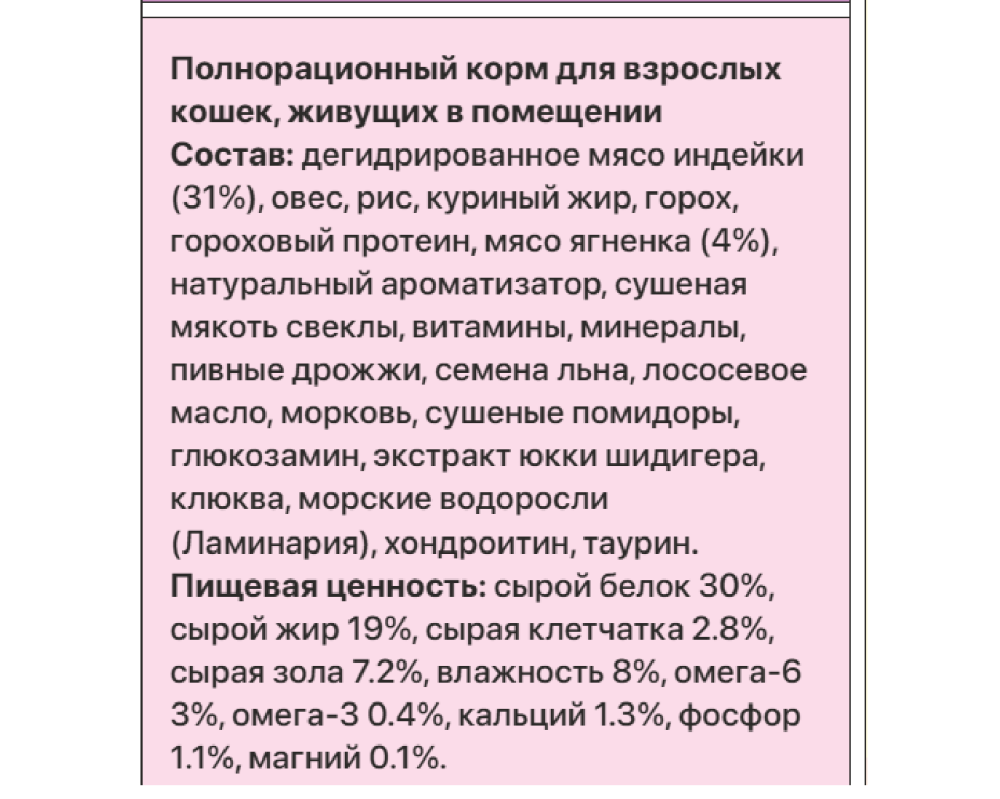 Рецептура ZILLII INDOOR - это оптимальное для организма количество животного белка, жира, клетчатки, витаминов и микроэлементов. Корм изготовлен на основе мяса индейки и ягненка. Диетическое и гипоаллергенное мясо индейки обладает прекрасной усвояемостью и высоким содержанием питательных веществ. Польза индейки в том, что ее мясо содержит в большом количестве такие витамины, как А и Е. По содержанию натрия индейка существенно опережает говядину и телятину. Именно благодаря натрию происходит пополнение объемов плазмы в крови и обеспечиваются нормальные обменные процессы, что очень важно для домашних кошек.