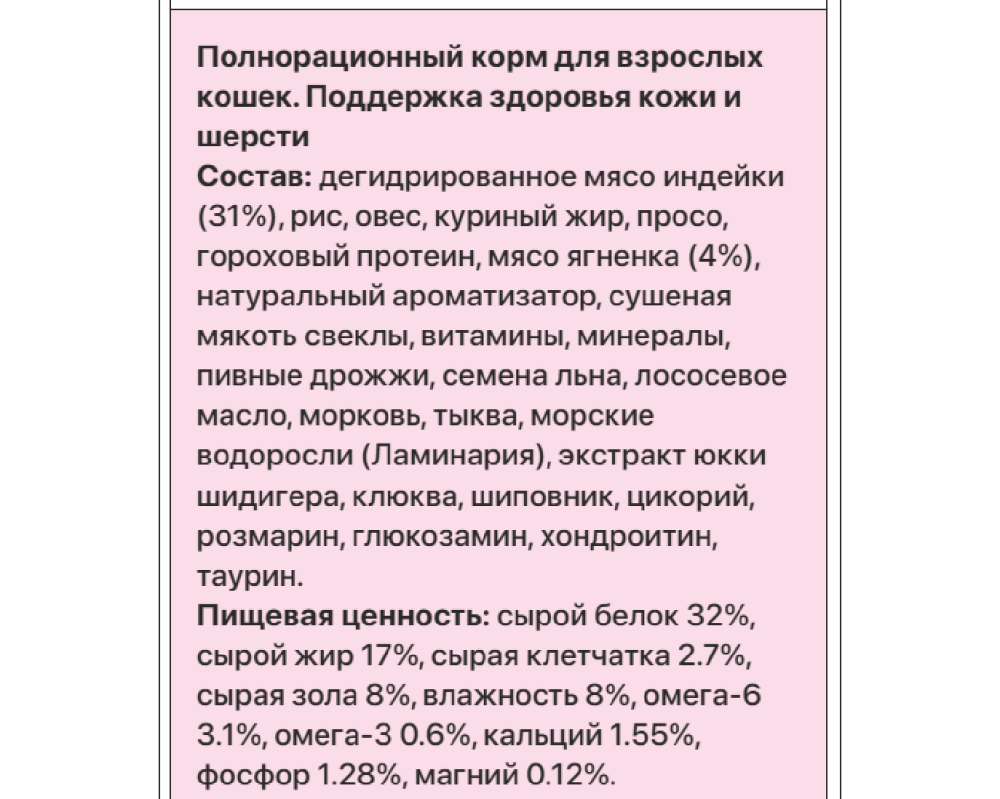 Специальные ингредиенты, содержащиеся в составе рецептуры, благотворно влияют на состояние шерсти, поддерживают её естественную красоту и блеск, способствуют здоровому росту.