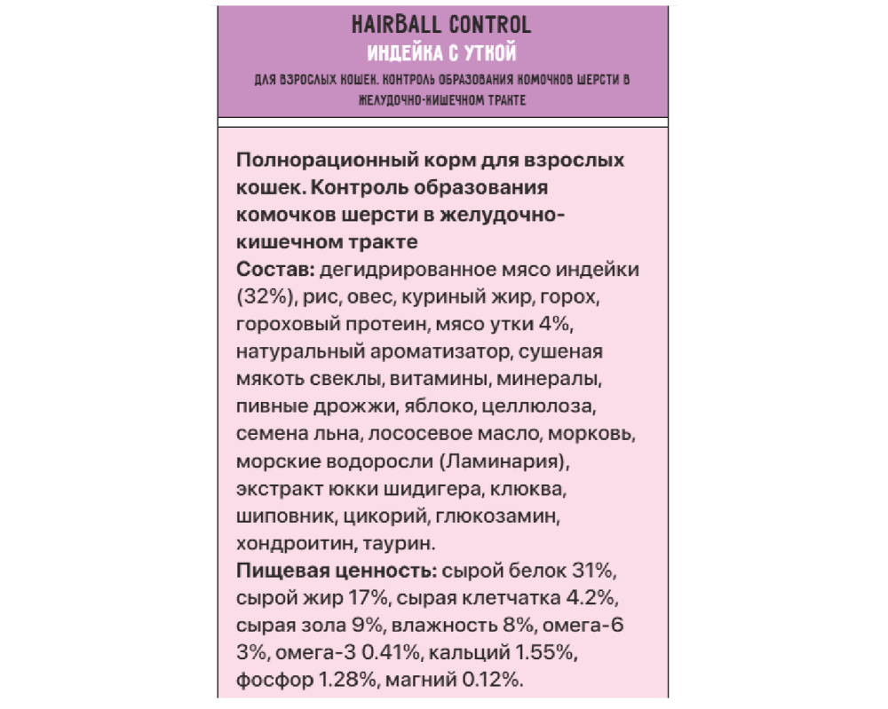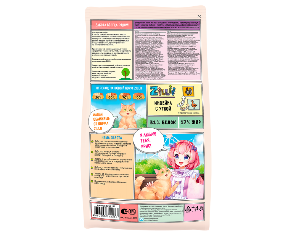 Состав полнорационного корма ZILLII HAIRBALL CONTROL способствует профилактике образования комочков шерсти в желудочно-кишечном тракте кошки. Различные типы клетчатки стимулируют естественный кишечный транзит. В результате чего, ежедневно попадающая в желудочно-кишечный тракт шерсть выводится из организма естественным образом, что и препятствует формирование комочков в ЖКТ у животного. Рецептура ZILLII HAIRBALL CONTROL учитывает все особенности организма кошки, так как изготовлена на основе дегидрированного мяса индейки и свежего мяса утки. Индейка, являясь диетическим мясом, обладает прекрасной усвояемостью и содержанием питательных веществ. Польза индейки в том, что ее мясо содержит в большом количестве такие витамины, как А и Е, а утиное мясо – витамины А, Е, К, В. При этом, в составе мяса утки в два раза больше витамина А, чем в любом другом виде мяса. Польза этого витамина в том, что он помогает улучшить состояние кожи и благотворно влияет на зрение. Полезные свойства утиного мяса также в его насыщенности белком. Утка является наиболее богатым источником незаменимых аминокислот. Формула ZILLII HAIRBALL CONTROL Turkey with Duck содержит оптимальное количество жиров.