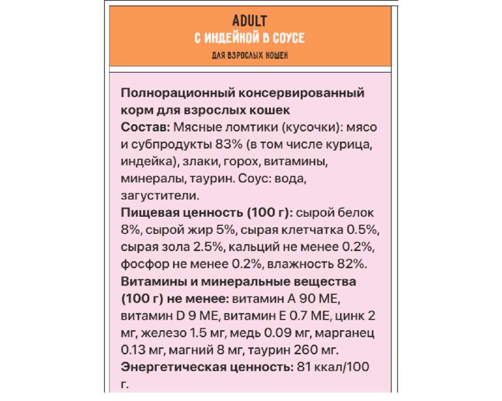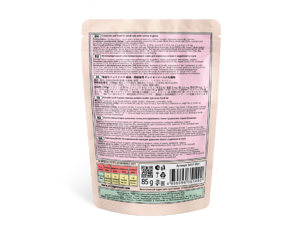 Полнорационный влажный корм ZILLII ADULT CAT with Turkey in gravy обеспечивает потребность кошек в питательных веществах, благодаря балансу кальция и фосфора в составе корма поддерживает здоровье опорно-двигательного аппарата. Рецептура изготовлена с использованием очень полезного для кошек диетического мяса, богатого содержанием таурина и витаминов – мяса индейки. Содержащийся в индейке натрий помогает пополнить объемы плазмы в крови и обеспечить нормальные обменные процессы. Основа рецептуры - натуральные ингредиенты. Оптимальное количество таурина, содержащееся в рецептуре ZILLII ADULT CAT with Turkey in gravy положительно влияет на работу сердечной мышцы.