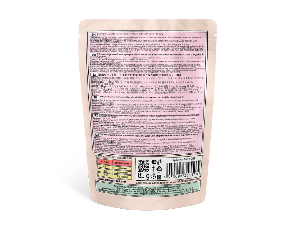 ZILLII Sterilized/Light Cat Turkey влажный корм (пауч) для кошек Индейка в желе, 85г