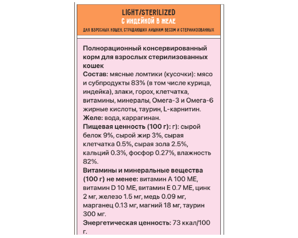 Вероятность набора лишнего веса - вот основная проблема стерилизованного животного. Сбалансированный полнорационный влажный корм ZILLII ADULT CAT LIGHT/STERILIZED with Turkey in gravy учитывает все особенности организма такой кошки. Данная рецептура изготовлена специально, чтобы помочь кошке чувствовать себя здоровой и активной. В составе формулы присутствует мясо индейки - наиболее диетическое и «нежное» мясо, обладающее прекрасной усвояемостью и содержанием питательных веществ. Содержащийся в индейке натрий помогает пополнить объемы плазмы в крови и обеспечить нормальные обменные процессы. Оптимально сбалансированные жирные кислоты Омега 3 и Омега 6 способствуют поддержке здоровья кожных покровов и шерсти животного, а добавленный в формулу L-карнитин, регулируя жировой обмен в организме животного, помогает бороться с лишним весом.