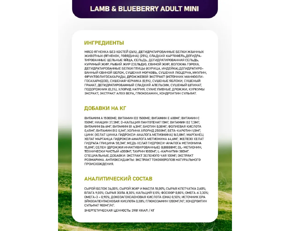 свежее мясо ягненка без костей (26%), дегидратированное мясо ягненка (25%), картофель, дегидратированные цельные яйца, свежая сельдь, дегидратированная сельдь, животный жир, рыбий жир, волокна гороха, сушеная морковь, сушеная люцерна, инулин, фруктоолигосахариды, маннанолигосахариды, порошок черники (0,5%), дегидратированные яблоки, порошок граната, дегидратированный сладкий апельсин, порошок шпината, подорожник (0,3%), порошок черной смородины, хлорид натрия, дрожжи сухие пивные, корень куркумы (0,2%), глюкозамин, хондроитин сульфат, экстракт календулы (источник лютеина).