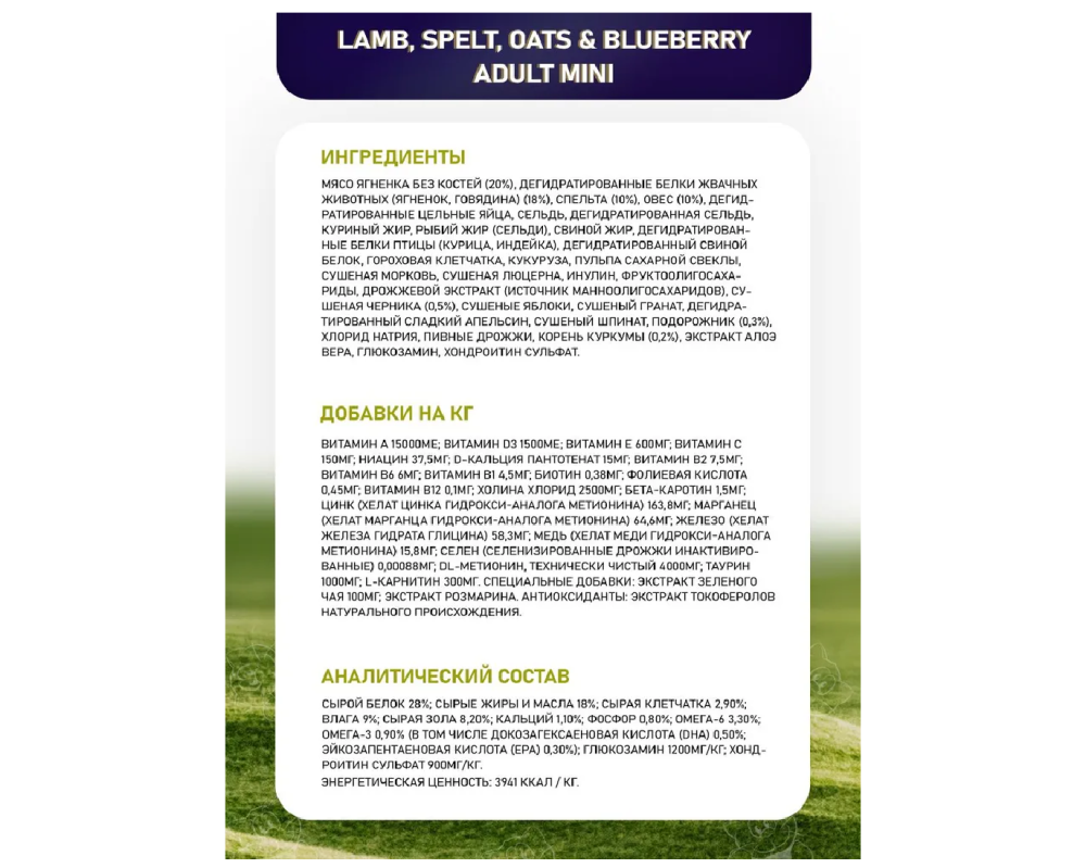 Основные ингредиенты: ягненок, спельта, овес, черника.