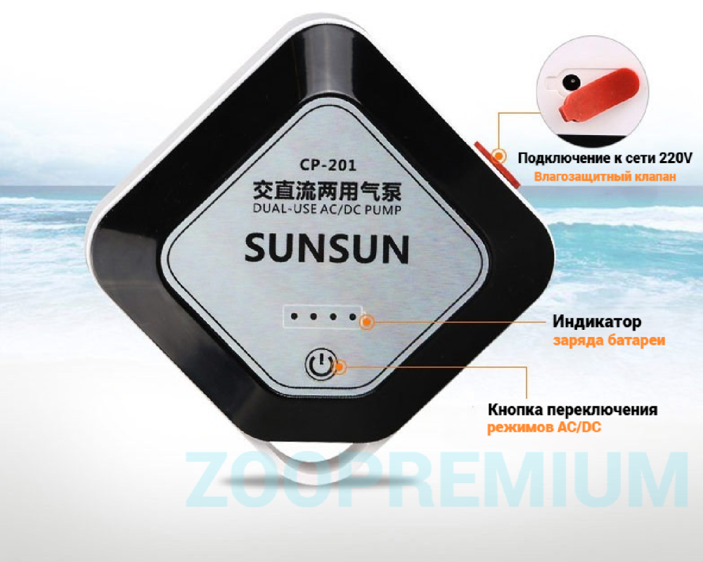 SUNSUN CP-101 Компрессор AC/DC 1Вт, 1,5 л/мин, 0,012MPa, 2200mAh, для аквар.до 100л