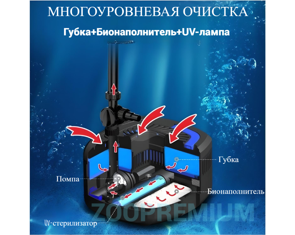 Многофункциональность: насос, фильтр и УФ-стерилизатор в одном корпусе