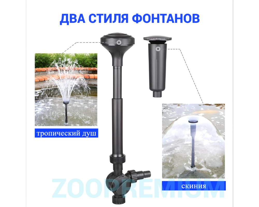 Фонтанные насадки: в комплекте 2 сменных насадки для создания различных водных эффектов