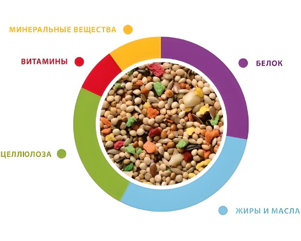 Смесь зерен и семян с сушеными фруктами, раскрошенным печеньем и измельченными ракушками, с витаминными добавками.