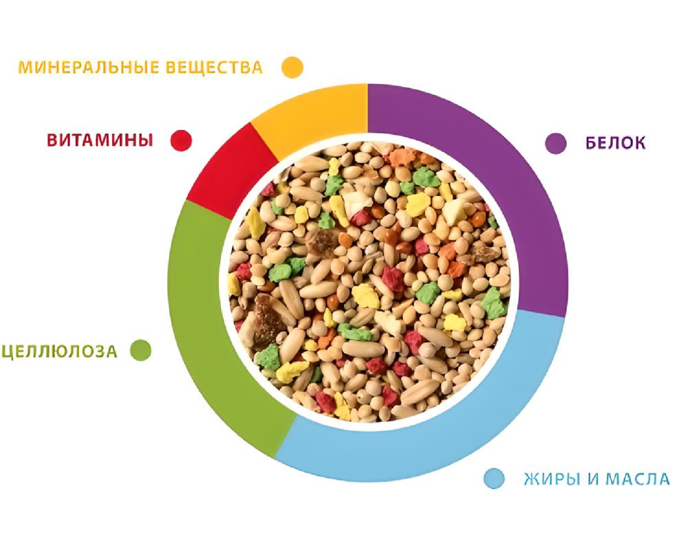 Смесь зерен и семян с сушеными фруктами, раскрошенным печеньем и измельченными ракушками, с витаминными добавками.