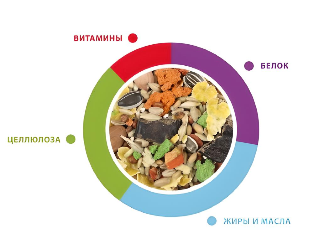 Смесь зерен и семян с сушеными фруктами и овощами, с витаминными добавками.