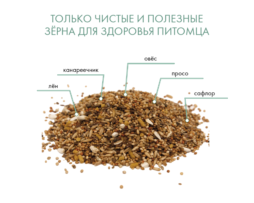 Корм содержит девять видов семян, обеспечивающих сбалансированный и разнообразный рацион для волнистых попугаев.
