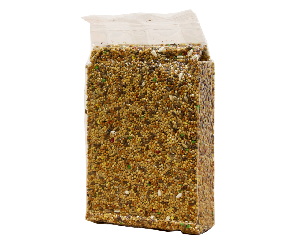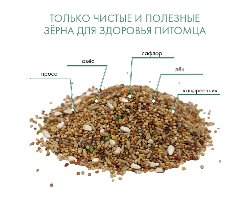 В состав входит желтое просо, красное просо, овес лущеный, белое просо, лён, сафлор канареечный, семена канареечника, пекарные продукты.