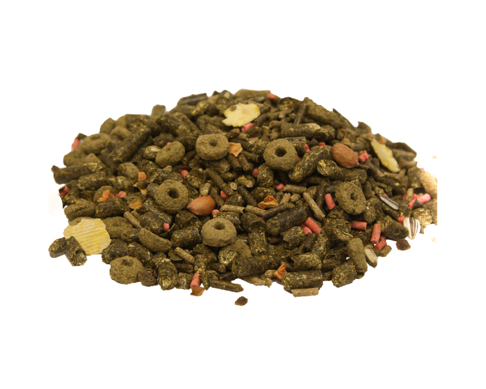 В состав корма входит давленый горох и морковь, в небольшом количестве арахис и семена подсолнечника, а также кубики ананаса, повышающие активность работы кишечника.
