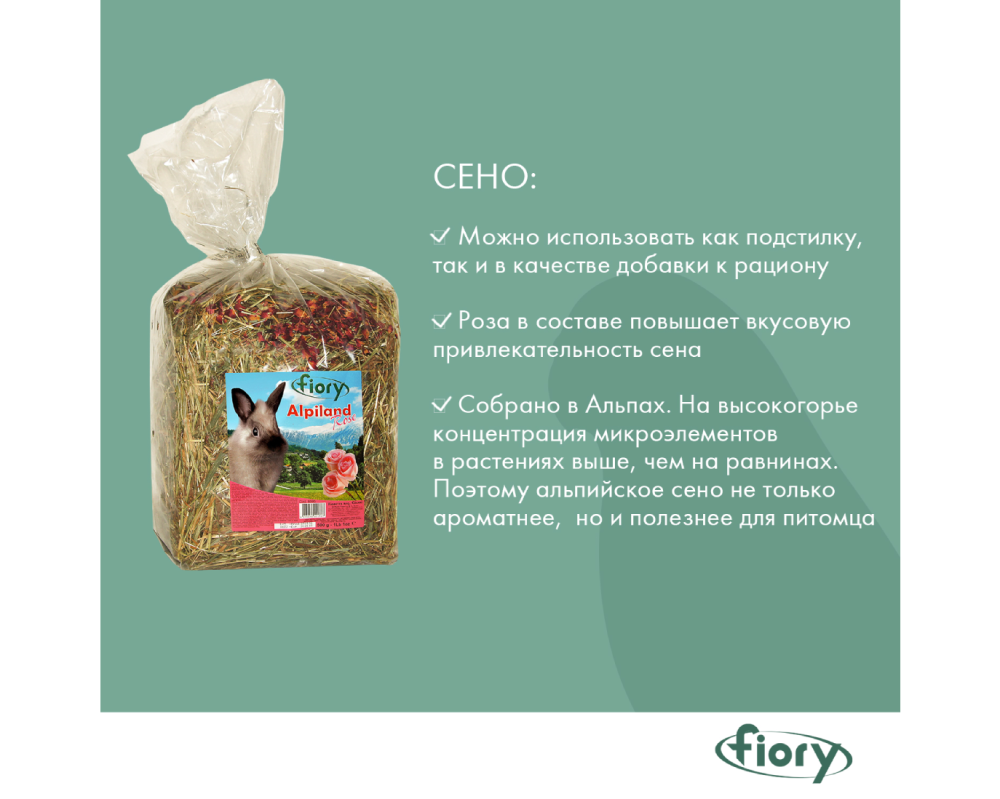 А еще компания Fiory использует сено второго укоса, т.к. оно содержит клетчатку, которая хорошо усваивается травоядными грызунами!