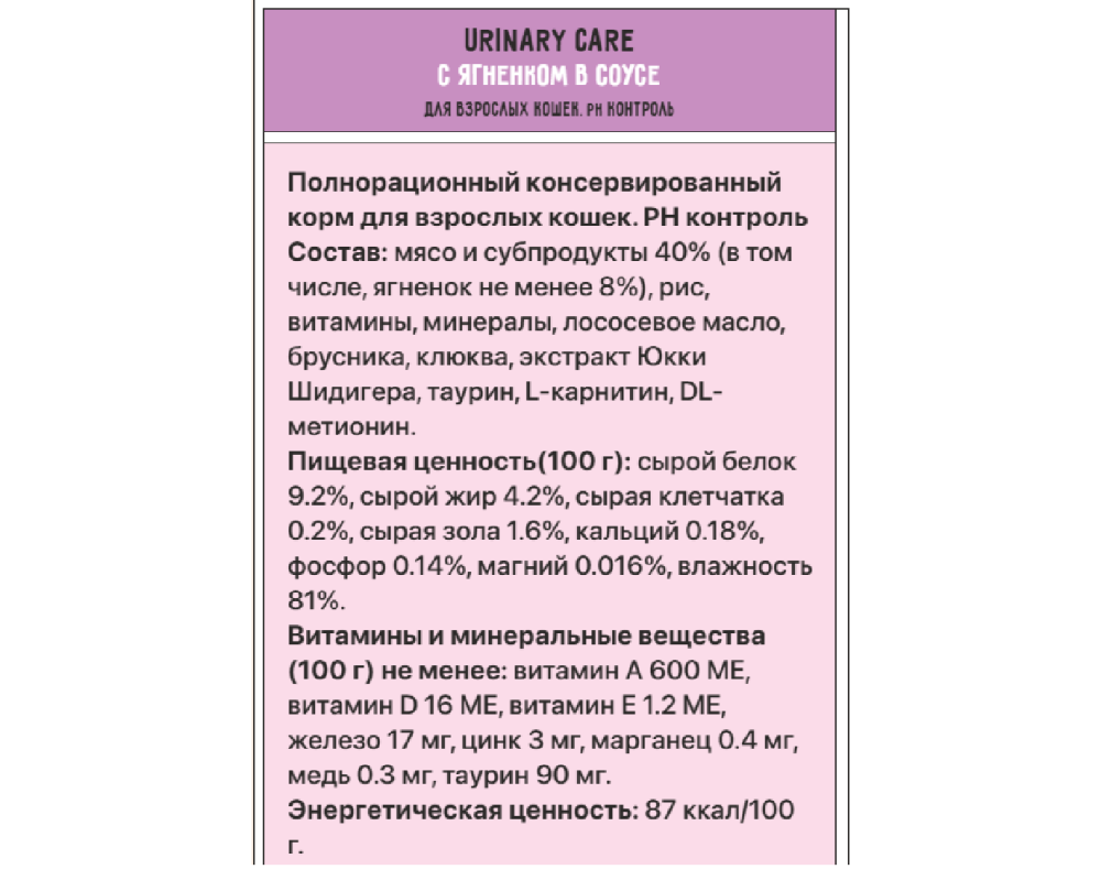 Рецептура влажного корма ZILLII HEALTHY CARE Urinary Care поддерживает работу мочевыделительной системы кошек, нормализуя уровень PH мочи, что способствует снижению риска заболевания мочекаменной болезнью (МКБ). Данная формула содержит специальные ингредиенты и необходимые добавки, помогающие в профилактике образования мочевых камней и обеспечивая поддержку здоровья мочевыводящих путей. Рецептура содержит достаточное для организма кошки количество питательных веществ, витаминов и минералов.
