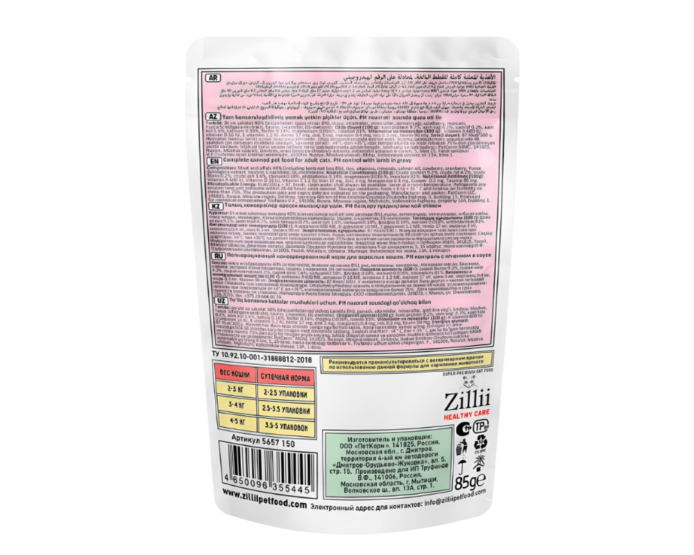 ZILLII HEALTHY CARE Urinary Care влажный корм (пауч) для кошек. РН контроль 85г Ягнёнок в соусе