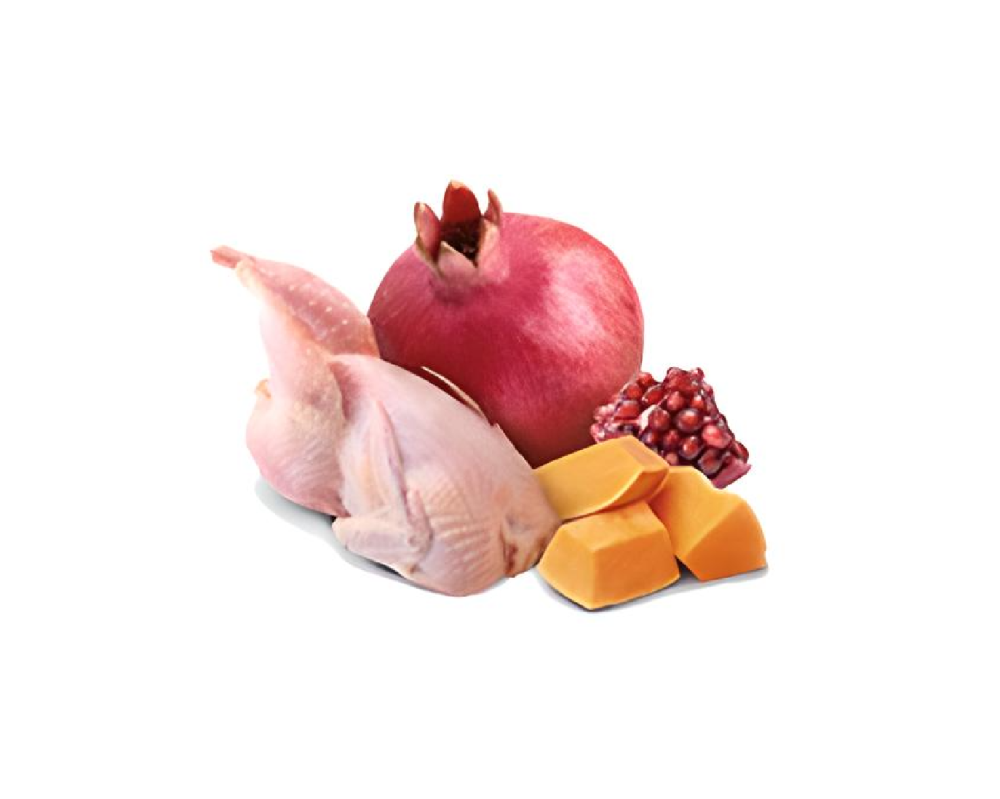 Перепелиное филе (30%), филе курицы, куриная голень, тыква (5%), рыбий жир, сельдь, свинина, ягненок, фруктоолигосахариды, хондроитин сульфат, глюкозамин, витамины, минералы.