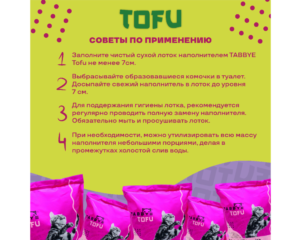 Гранулы натурального наполнителя не создают пыль и не разносятся по квартире. Наполнитель Tabby Tofu биоразлагаемый, поэтому его можно утилизировать в канализацию и не бояться засоров.