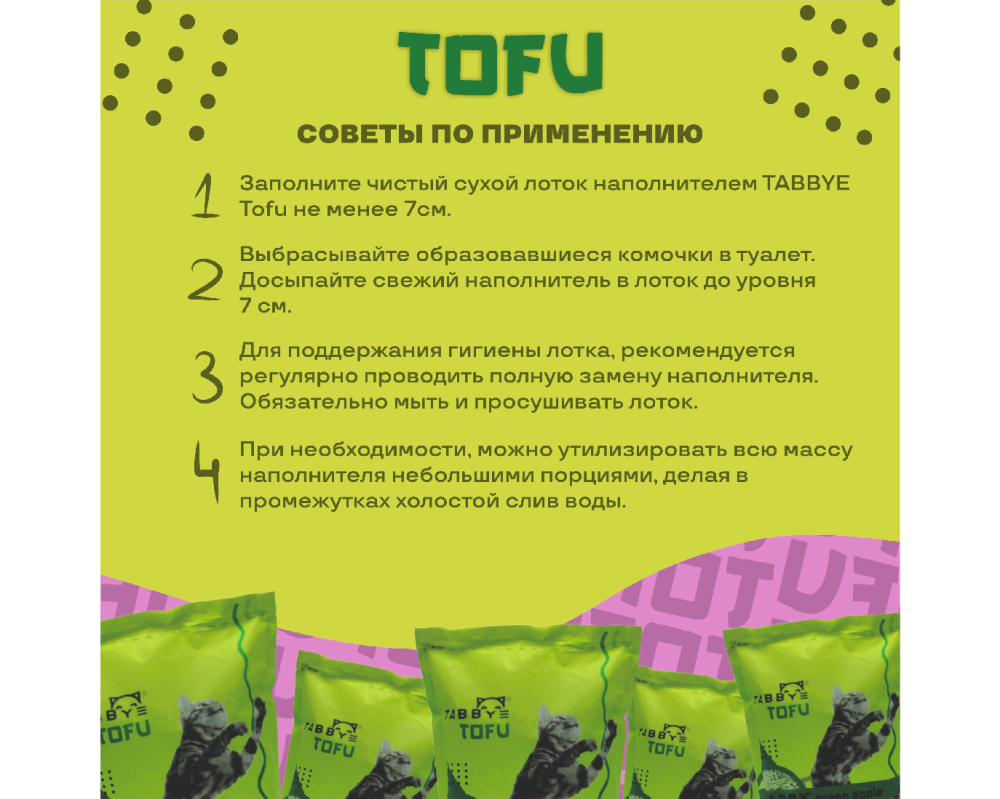 Гранулы натурального наполнителя не создают пыль и не разносятся по квартире. Наполнитель Tabby Tofu биоразлагаемый, поэтому его можно утилизировать в канализацию и не бояться засоров.