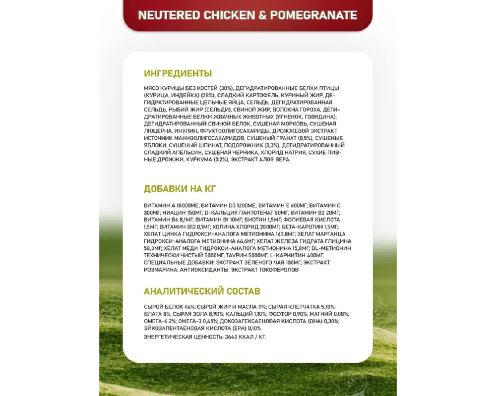 Мясо курицы без костей (30%), дегидратированные белки птицы (курица, индейка) (28%), сладкий картофель, куриный жир, дегидратированные цельные яйца, сельдь, дегидратированная сельдь, рыбий жир (сельди), свиной жир, волокна гороха, дегидратированные белки жвачных животных (ягненок, говядина), дегидратированный свиной белок, сушеная морковь, сушеная люцерна, инулин, фруктоолигосахариды, дрожжевой экстракт (источник маннoолигосахаридов), сушеный гранат (0,5%), сушеные яблоки, сушеный шпинат, подорожник (0,3%), дегидратированный сладкий апельсин, сушеная черника, хлорид натрия, сухие пивные дрожжи, куркумы (0,2%), экстракт алоэ вера.